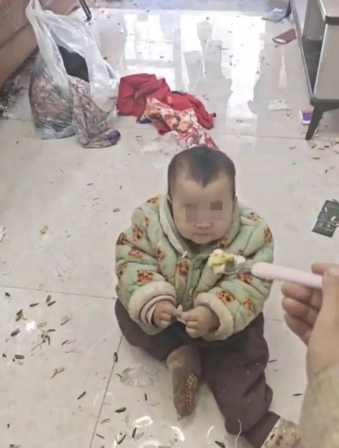 一个看起来只有1岁多的孩子,穿得也是脏兮兮的,在地上爬来爬去,妈妈则在追着喂饭。